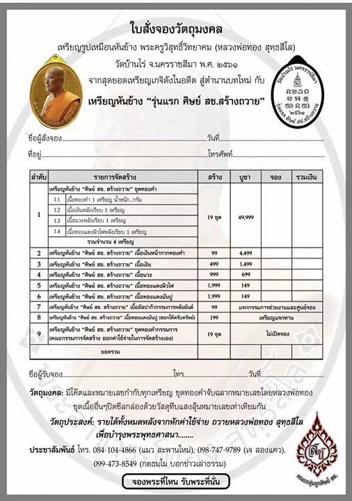 เหรียญหันข้าง หลวงพ่อทอง สุทฺธสีโล วัดบ้านไร่ อ.ด่านขุนทด จ.นครราชสีมา รุ่นรับทรัพย์ ศิษย์ สช. สามแชะสร้างถวาย ปี 2561 แกะโดยช่างจรัญ