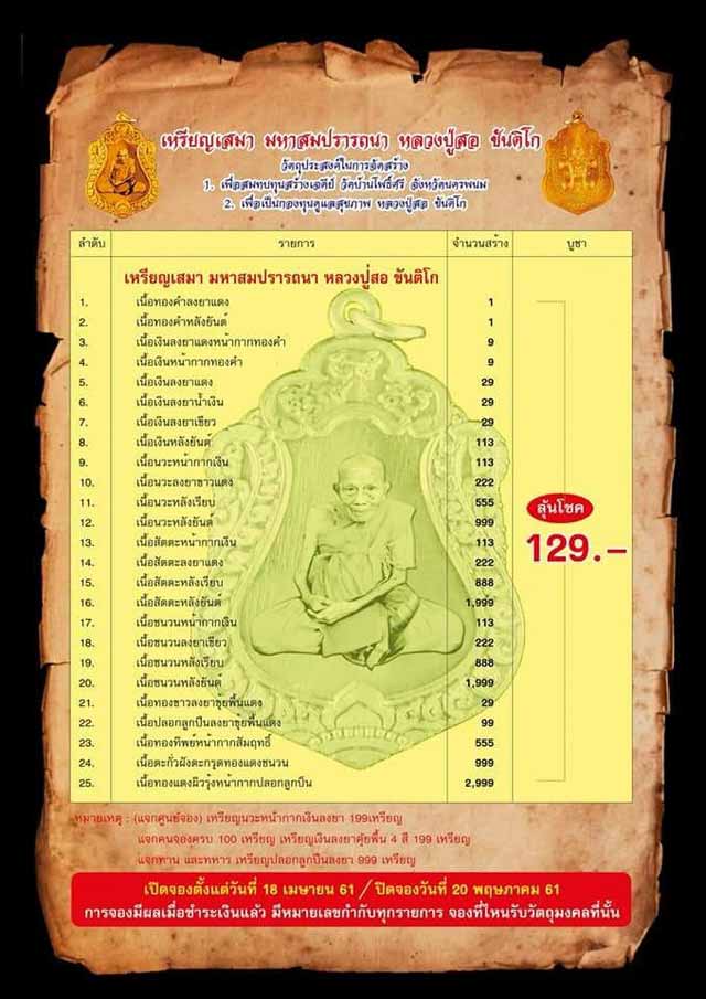 วัตถุประสงค์: เพื่อสมทบทุนสร้างเจดีวัดโพธิ์ศรี และสมทบทุนกองทุนดูแลสุขภาพหลวงปู่สอ