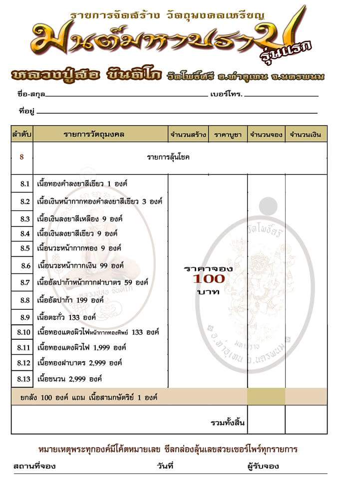 วัตถุประสงค์: เพื่อสมทบทุนสร้างเจดีวัดโพธิ์ศรี และสมทบทุนกองทุนดูแลสุขภาพหลวงปู่สอ
