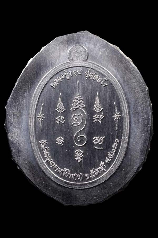 เนื้อตะกั่วปั้มนำฤกษ์ หลังกึ่งเรียบ ติดเกศา+จีวร ราคา 800 บาท มียอด 5 เหรียญ