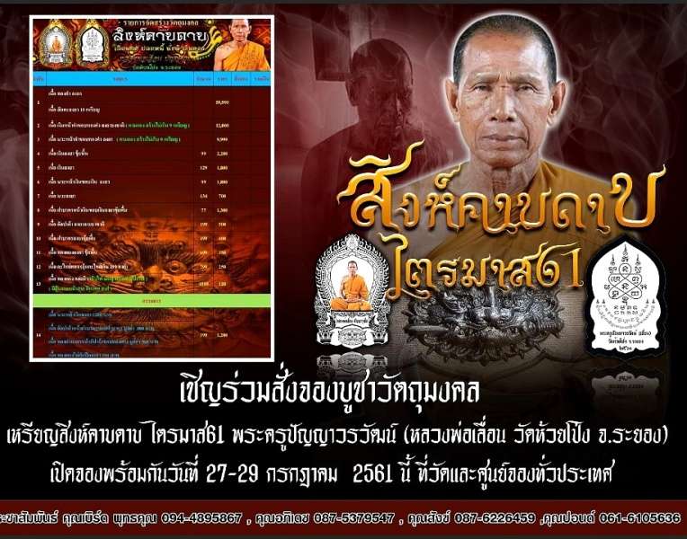 เปิดจองเหรียญสิงห์คาบ ไตรมาส61 หลวงพ่อเลื่อน วัดห้วยโป่ง ระยอง 77ปี55พรรษา