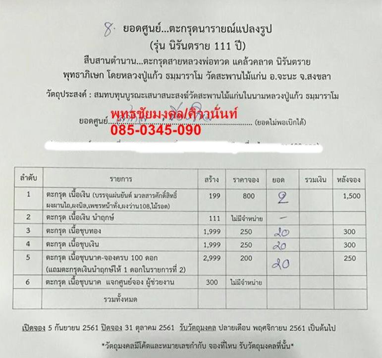 รับวัตถุมงคล ปลายเดือนพศจิกายน 61 เป็นต้นไป