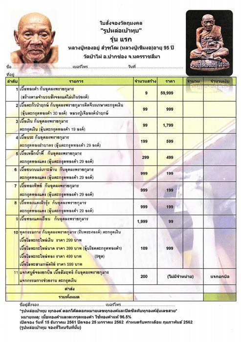 รายการ 2.เนื้อตะกั่วนำฤกษ์ ก้นอุดผงพรายกุมาร ติดจีวรเกษา ตะกรุดเงิน ราคาจอง 999.-บาท มียอด = สอบถาม