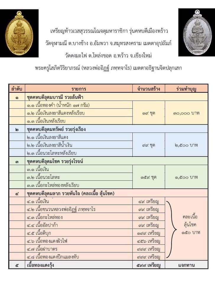 เปิดจองให้ร่วมทำบุญ เหรียญท้าวเวสสุวรรณโณจตุมหาราชิกา "รุ่นคหบดีเมืองพร้าว" วัดจุฬามณี อ.อัมพวา จ.สมุทรสงคราม เมตตาอุปถัมภ์สร้างอุโบสถล้านนา วัดดงมะไฟ ต.โหล่งขอด อ.พร้าว จ.เชียงใหม่