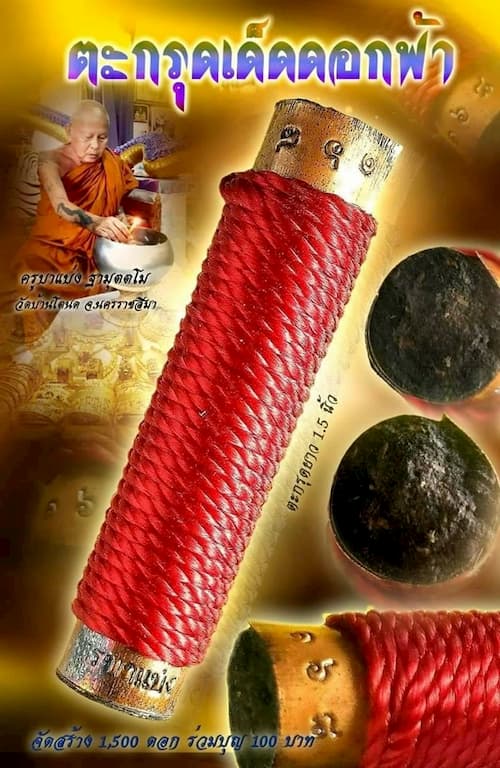 ตะกรุดเด็ดดอกฟ้า รุ่นนี้แรงมากๆทางด้านมหานิยม มหาเสน่ห์ เพราะครูบาท่านใช้แป้งมหาเสน่ห์ มหารัก มหาหลง มาเป็นมวลสารหลักในการอุดตะกรุด และยังมีว่านต่างๆ เช่น ว่านดอกทอง ว่านสาวหลง ว่านไก่แดง น้ำมันมหาเสน่ห์ สีผึ้งสาริกาปากดีเพื่อให้ตะกรุดรุ่นนี้ มีอานุภาพที่แรงส่งเสริมให้สมหวังรวดเร็วและเห็นผลทันตา ครูบาแบ่งกำกับเสกมาอย่างดี ใช้แล้วเด่นทางด้านมหานิยม มหาเสน่ห์ยิ่งนัก ผงมวลสารต่างๆที่นำมาอุดนี้อยู่กับครูบาแบ่งมามากกว่า 10ปี ท่านเสกทุกวันเรื่อยมา จนมีอานุภาพแรงเหนือผงเสน่ห์ทั้งปวง ตะกรุดนี้หากชาย หรือหญิง ยังไม่มีแฟน หามาบูชาเลย แม้รูปไม่หล่อ ไม่สวย ก็จะมีคนมารัก หรือ หากใช้ไปเกี้ยวใครก็จะสำเร็จโดยง่าย เรียกได้ว่าแม้ไม่หล่อ ก็สามารถมีเมียสวยเหมือนดอกฟ้านั่นเอง