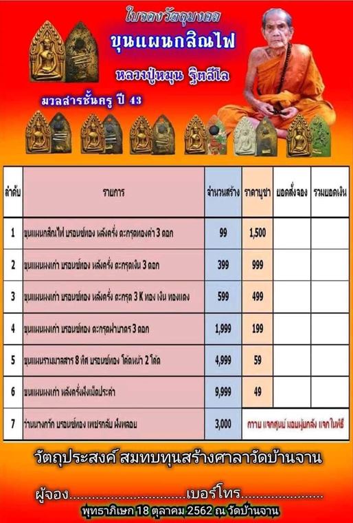 รายการ 1.ขุนแผนกสิณไฟ บรอนซ์ทอง หลังคลั่ง ตะกรุดทองคำ 3 ดอก ราคาจอง 1,500.-บาท มียอด = 2
