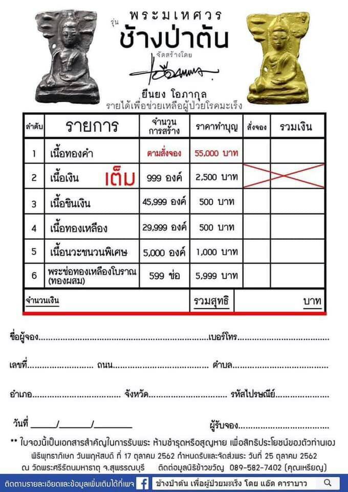 ....มีข่าวดีมาประกาศครับ เนื่องจากมีผู้อยากได้เนื้อเงิน 999 เป็นจำนวนมากที่จองเข้ามา แต่ว่ามันเต็มแล้ว คณะกรรมการจัดสร้างเลยตกลงจะเเบ่งเนื้อนวโลหะ จำนวน 2,000 องค์(จากที่จัดสร้างทั้งหมด5,000องค์เพื่อใช้แจกแขกผู้ใหญ่ที่มีอุปการะคุณ) เราขอจำหน่ายเพียงองค์ละ1,000 บาทเท่านั้นครับ และมีแค่2,000 องค์ จะมีรันนิ่งนัมเบอร์และตอกโค้ดเช่นเดียวกับเนื้อเงิน