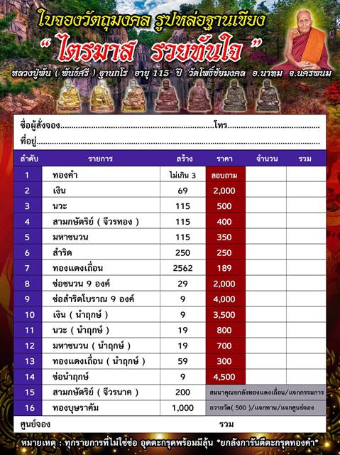 *** เปิดจอง// รูปหล่อฐานเขียง "ไตรมาส รวยทันใจ" หลวงปู่พัน (พันธ์ศรี) ฐานกโร อายุ 115 ปี วัดโพธิ์ชัยมงคล อ.นาทม จ.นครพนม