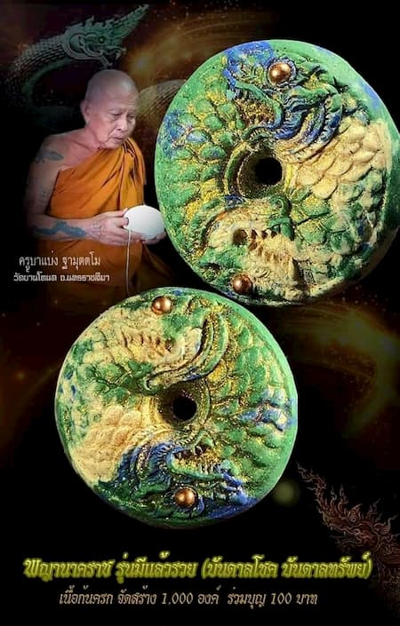 (บันดาลโชคบันดาลทรัพย์) ครูบาแบ่งท่านใส่ผงแป้งลูกสาวพญานาคราชที่ได้มาจากถ้ำโบราณเมื่อหลายสิบปีทีแล้ว และผงดูดทรัพย์ เรียกเงิน ผงนะมหาเสน่ห์ ผงเสกมนต์นาคราช ให้เอามาใส่ในรุ่นนี้และทำการปลุกเสกโดยใช้มนต์นาคราชสายวิชาลาวโบราณ โดยทำการปลุกเสกให้เป็นเครื่องรางแห่งนาคราช ที่นำออกมาเพื่อช่วยให้ลูกหลานสายพญานาคหรือคนที่นับถือองค์ท่านมีไว้บูชา ผู้ใดที่ได้ครอบครองชีวิตจะพบกับความร่ำรวย มีโชคมีลาภ มีเงินทอง มีรักแท้ที่ยั่งยืน หยิบหรือจับอะไรก็เป็นเงินเป็นทอง เสี่ยงโชคอันใดก็จะสำเร็จและบันดาลโชคให้มีแต่ความร่ำรวย ลูกหลานคนไหนที่ร่ำรวยอยู่แล้ว พอมีครอบครองจะรวยๆยิ่งๆขึ้นไป เสมือนกุญแจไขประตูเปิดทางให้กับชีวิต ให้ความสมบูรณ์พูนสุข โชคลาภวาสนาบารมี ไหลเข้ามาในชีวิตของลูกหลานผู้นั้นทันที