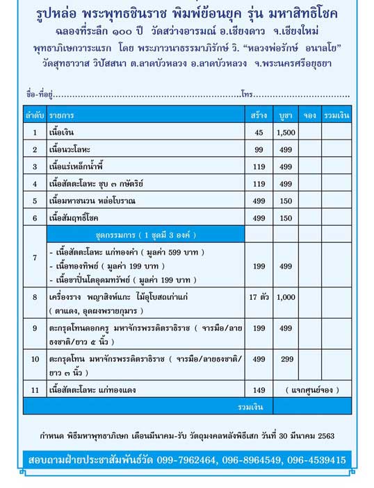 รายการสั่งจอง รูปหล่อ พระพุทธชินราช พิมพ์ย้อนยุค รุ่น มหาสิทธิโชค