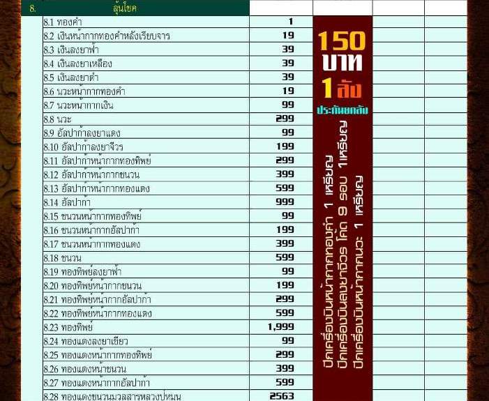 8.รายการลุ้นโชค 28 เนื้อ มียอด 30 เหรียญ ราคาจองเหรียญละ 150 บาท