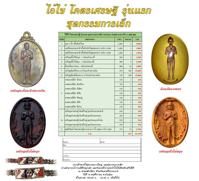 ไอ้ไข่ รุ่น โคตรเศรษฐี จ.นครศรีธรรมราช ชุด กรรมการเล็ก 1 ชุด ราคา 18, 000 บาท รับวัตถุมงคล 253 ชิ้น ตามรายการ ตกเฉลี่ย ชิ้นละ ไม่ถึง 72 บาท พระเสก วันที่ 8 เดือนพฤศจิกายน ณ ศาลหลักเมือง จ.นครศรีธรรมราช สนใจจองแจ้งได้ครับ มียอด 5 ชุด