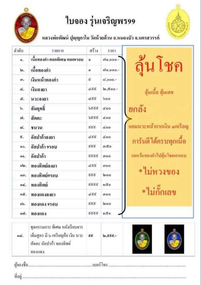 มี 1 ลัง 100 ลุ้น ราคายกลัง 25,000.-บาท รับพระประมาณต้นเดือนตุลาคม 63 รายการพระตามรายละเอียดในใบจอง คุ้มค่าชัวร์