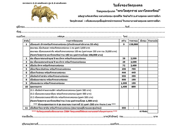 วัตถุประสงค์ สมทบทุนซื้ออุปกรณ์การแพทย์โรงพยาบาลด่านขุนทด จ.นครราชสีมา