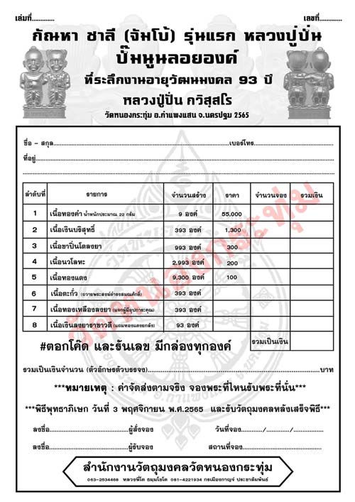 รายการที่ 5 เนื้อทองเเดง สร้าง 9300 องค์ ราคาจอง 100 บาท มียอด 100 องค์