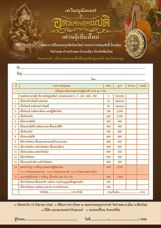 รายการ 15.ชุดเศรษฐีเชียงใหม่ (รับวัตถุมงคล 3 องค์) ราคาจอง 1,999.-บาท มียอด = 5