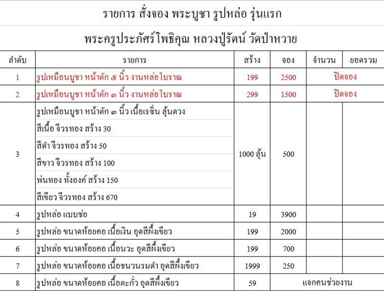 รายการ 3.รูปเหมือนบูชา หน้าตัก 3 นิ้ว เนื้อเรซิ่น (ลุ้นดวง) ราคาจอง 500.-บาท มียอด= 50