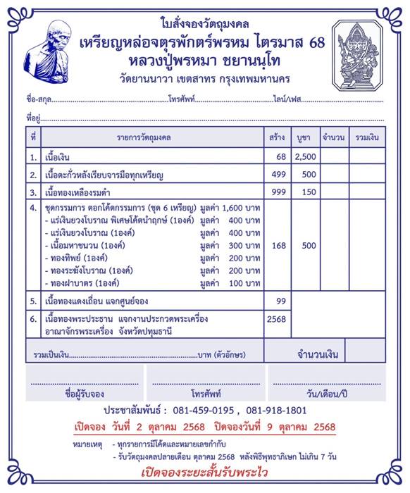 *** เปิดจอง// เหรียญหล่อ จตุรพักตร์พรหม ไตรมาส 68 หลวงปู่พรหมา ชยานนฺโท วัดยานนาวา เขตสาทร กรุงเทพมหานคร