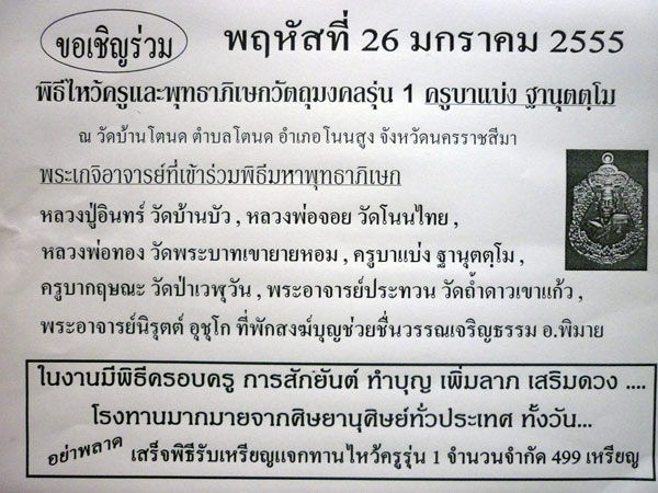วัตถุมงคลทั้งหมดที่จะทำพิธีมหาพุทธาภิเษก เหรียญไหว้ครูรุ่นแรก ตอนนี้อยู่ในห้องหลวงพ่อทั้งหมดตั้งแต่วันที่ 20 ม.ค.ที่ผ่านมาเรียบร้อยครับ หลวงพ่อเมตตาปลุกเสกเดี่ยวๆให้ก่อนรวมทั้งหมด 7 วัน 7 คืน 7 วาระ ............สุดยอดครับรุ่นนี้ พิธีใหญ่อย่างนี้ พระเกจิอาจารย์ร่วมปลุกเสกมากขนาดนี้ พ.ศ.นี้ต้องถือว่ายิ่งใหญ่ที่สุด สุดเข็มขลัง ...........
