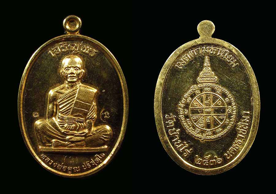เหรียญเจริญพรบนเต็มองค์หนังสือโค้งประคตมน เนื้อทองคำ ตอกโค็ด นะ และหมายเลข ๘ และเลข ๙ ส่วนใหญ่จะเห็นอยู่ในหนังสือรวมเล่มหลวงพ่อคูณและจะเห็นแต่รูปด้านหน้าเหรียญจะไม่เห็นรูปด้านหลังเหรียญตัวอย่าง2เหรียญนีี้ก็เป็นหนังสือโค้งประคตมนยังไม่พบเห็นหนังสือตรงเลยทั้งที่จำนวนจัดสร้างเนื้อทองคำมี19เหรียญอาจจะถูกหลอมคืนไปบ้างส่วนก็ทำให้เหลือน้อยลงมาก ผมได้เห็นเหรียญจริงมาแล้วเป็นเนื้อทองคำหนังสือโค้ง ตอกโค็ต(นะ)ตอกโค็ดหมายเลข(๑) ซึ่งตอนนี้ได้อยู่ในร้านของอ.มหาเวส และเป็นเหรียญที่ได้รางวัลที่1ในงานประกวดพระเครื่องที่โคราชที่ผ่านมาด้วยครับ |