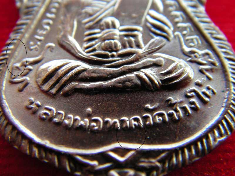 -ขอบซุ้มด้านในเหนือช้างตัวขวามือของหลวงปู่จะมีกลุ่มเนื้อเกินเป็นจุดเล็กๆคมๆพยายมเอียงเหรียญส่องนะครับแล้วจะเห็น ของเก้จะเห็นแต่เบลอๆครับ