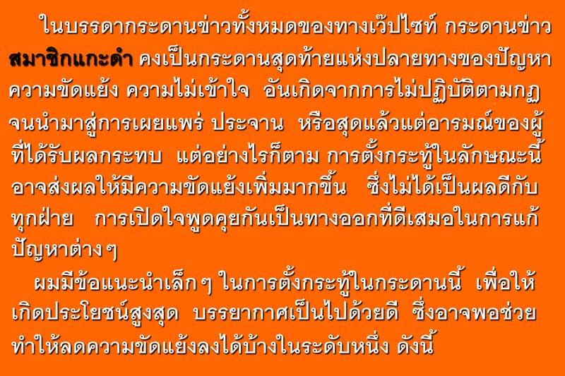หัวข้อกระทู้ : => หลักเกณฑ์การตั้งกระทู้ในกระดาน สมาชิกแกะดำ คิดและพิจารณาสักนิดก่อนการตั้งกระทู้ .............. |