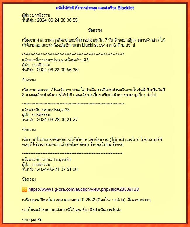 เพื่อนสมาชิกลองพิจารณาดูนะครับ ไม่อยากให้คนแบบนี้มาอยู่ในสังคม คนขาย..เสียเงินตั้งกระทู้ เสียหน้าพระ เสียเวลาตามอีก โดยเดี๋ยวผมจะแจ้งทาง G-Pra ให้ติดตามเรื่องนี้ตรวจสอบไม่ให้เป็นเยี่ยงอย่างนะครับ |