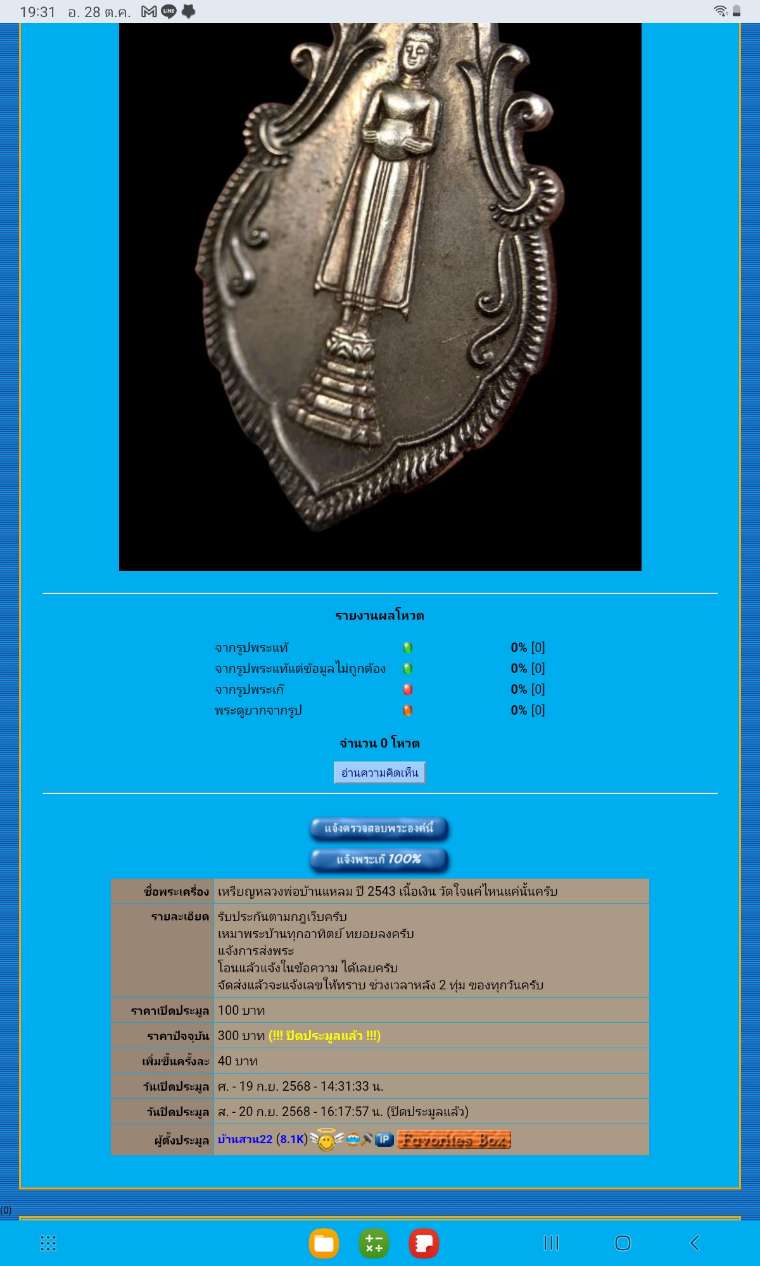 ลงพระว่าเนื้อเงินพอยิงเลเซอร์มาไม่ใช่เนื้อเงิน ติดต่อก็ไม่ได้อ่านเมลก็ไม่ตอบ ฟีตแบค((เฉยๆเยอะ))เพื่อนๆสมาชิกเคาะก็ระวังกันหน่อยนะคะ ถ้าเป็นพระราคาแพงต้องซื้อขายระวังนะคะ ขนาดราคาเบาๆยังขนาดนี้  |
