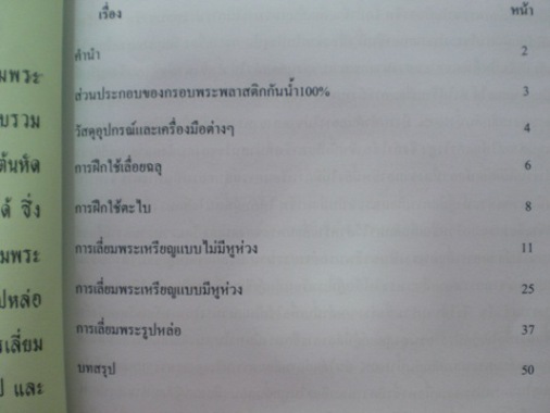 จำหน่าย "คู่มือเลี่ยมพระฉบับมืออาชีพ" พลาสติกกันน้ำ100% คู่มือเล่มนี้จัดทำขึ้นเพื่อใช้ประกอบการเรียนการสอนงานเลี่ยมพระพลาสติกกันน้ำ100% ให้กับผู้ที่มาเรียนกับผู้เขียน โดยรวบรวมวิธีการทำงานที่ง่ายและให้ผลที่รวดเร็ว เหมาะสำหรับผู้ที่เริ่มต้นหัดเลี่ยมพระตั้งแต่ยังไม่เป็นจนสามารถจนสามารถเลี่ยมพระเป็นอาชีพได้ ซึ่งเนื้อหาสอนวิธีการใช้อุปกรณ์ต่างๆที่สำคัญ และการเลี่ยมพระขั้นพื้นฐานของผู้ที่เริ่มต้นหัดเลี่ยมพระเช่น พระเหรียญ พระรูปหล่อ คู่มือเล่มนี้มีทั้งหมด 50 หน้า เนื้อหาประกอบด้วย ส่วนประกอบของกรอบพลาสติกกันน้ำ100% วัสดุอุปกรณ์และเครื่องมือต่างๆ การฝึกใช้เลื่อยฉลุ การฝึกใช้ตะไบ การเลี่ยมพระแบบไม่มีหูห่วง การเลี่ยมพระแบบมีหูห่วง การเลี่ยมพระรูปหล่อ ซึ่งมีรูปภาพประกอบอย่างละเอียดทุกขั้นตอนเข้าใจง่าย จำหน่ายราคา เล่มละ 200 บาท สำหรับท่านที่ต้องการให้จัดส่ง ems เพิ่มค่าส่ง 50 บาทครับ สนใจสอบถาม 089-0035782 สำหรับท่านที่ต้องการหัดเลี่ยมพระใช้เองครับ หรือจะทำเป็นอาชีพก็สามารถศึกษาจากคู่มือเล่มนี้ได้ครับ เรายังมีคู่มือเล่มต่อๆที่มีเนื้อหาการเลี่ยมพระที่ซับซ้อนขึ้นเหมาะสำหรับท่านที่มีพื้นฐานแล้ว ติดตามคู่มือเล่มต่อไปได้ครับ |