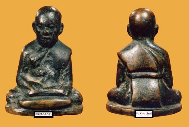 รูปหล่อรุ่นแรกหลวงพ่อจาด วัดบางกระเบา อ.บ้านสร้าง จ.ปราจีณบุรี สร้างประมาณปี 2483-85 เกจิดังในยุคสงครามอินโดจีน สำหรับองค์นี้พิเศษหลาย ๆ อย่างคือ องค์พระจะเป็นพิมพ์หน้าหนุ่ม เป็นพิมพ์ที่มีการตอกโค๊ด 3 แถวทั่วไป แต่องค์นี้ถูกตะไบเสียจนฐานแถบจะไม่มีให้เห็น ดังนั้นจึงไม่ปรากฎโค๊ดให้เห็น แต่เป็นพระแต่ง-เกลาผิวมาแต่เดิม ทำให้พระน่ารักดีครับ <<==ที่สำคัญพระองค์นี้เคยปรากฎรูปโชว์ในหนังสือพิมพ์เดลินิวส์มาแล้ว==>>(องค์จริงผิวจะเหลืองอมเขียวไม่ออกแดงเหมือนในภาพครับ) |