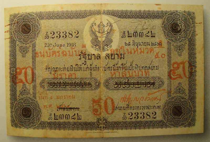 ภาพที่ ๒ ธนบัตรแบบที่ ๑ รุ่นที่๒ ชนิดราคา ๕๐ บาท ที่ทางการแก้ไขจากธนบัตรชนิดราคา ๑ บาท |