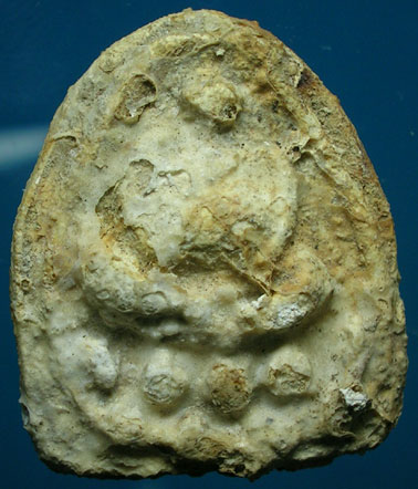 พระสังกัจจายน์ในภาพดูง่ายเต็มไปด้วยคราบกรุที่ขึ้นตามธรรมชาติเป็นเอกลักษณะของพระกรุวัดเงินคลอยเตยโดยเฉพาะ คือจะพบคราบแบบฟองเต้าหู้ ซึ่งดูยับยู่ยี่เป็นแผ่นๆมีทั้งเกาะแน่นสลับแทรกตัวเกาะอยู่ทั้งด้านหน้าด้านหลังแล้วด้านข้างทั่วๆไป นอกจากนั้นยังพบคราบตะกรันที่เกิดจากเศษปูน เศษเม็ดทราย เศษต่างๆที่อยู่ในเจดีย์ กระเทาะร่วงหล่นลงมาเกาะผิวพระและเกาะแน่นกับคราบกรุฟองเต้าหู้ให้พบเห็นนี้ด้วยครับ