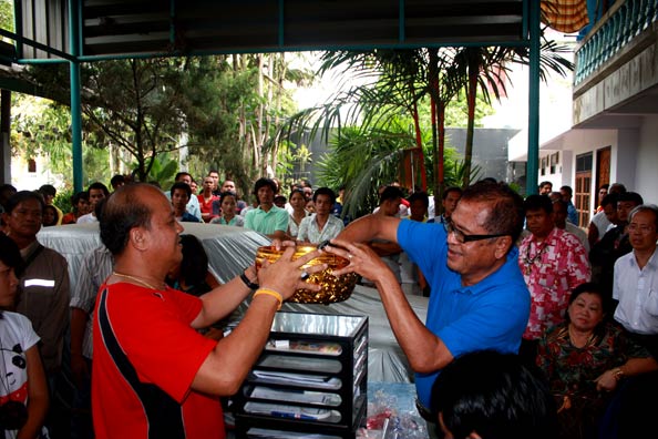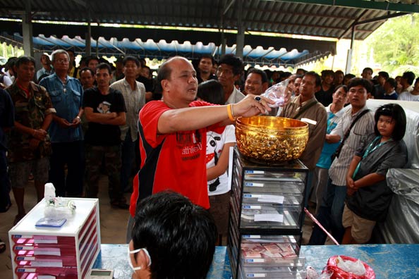 รูปแรก เป็นกรรมการวัดกำลังเทฉลากซึ่งบรรจุอยู่ในหลอดกาแฟ ลงขันที่เตรียมไว้