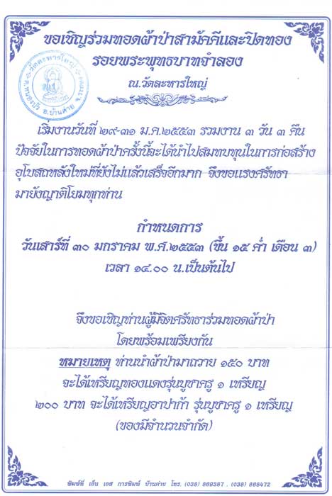 ขอเชิญร่วททอดผ้าป่าสามัคคีและปิดทองรอยพระพุทธบาทจำลอง ณ วัดละหารใหญ่ (หลวงพ่อสิน)