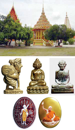 ส่วนวัตถุมงคลนั้น ท่านอนุญาตให้คณะศิษย์จัดสร้างในโอกาสสำคัญต่างๆ โดยรุ่นแรกเป็นเหรียญรูปเหมือน สร้างเมื่อปี พ.ศ.2519 มีหลายรูปแบบ ทั้งเนื้อโลหะ และเนื้อผง เครื่องรางของขลัง มีประสบการณ์แบบครบเครื่อง ไม่ว่าจะเป็นเรื่องเมตตาค้าขาย เรื่องแคล้วคลาด คงกระพัน ก็ช่วยให้ผู้ที่พกพาบูชาติดตัวรอดพ้นอันตรายมาอย่างน่าอัศจรรย์
