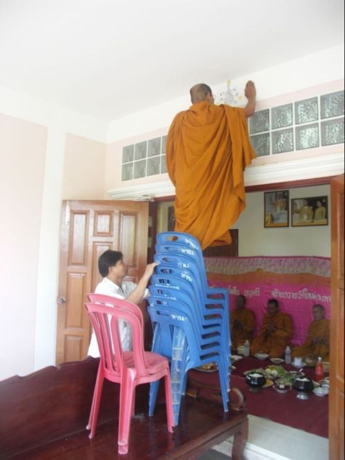 เรื่องของหลวงพ่อสินเป็นปัจจังตังครับ พี่ๆที่ได้เจอด้วยตัวท่านเองจะรู้ได้ทุกท่าน พอดีก่อนเกิดเหตุการณ์ที่เป็นข่าวได้ไม่กี่วัน ผมได้ไปที่บ้านญาติซึ่งทำบุญขึ้นบ้านใหม่ เจ้าของบ้านต้องการเจิมบ้านแต่ไม่มีอุปกรณ์ในการเจิม หลวงพ่อสินจึงแนะนำเจ้าของบ้านให้ใช้เก้าอี้ต่อๆกันเกือบสิบตัวดังภาพ ผมไปถึงบ้านงานเกือบเจ็ดโมงเช้าก็เห็นหลวงพ่อท่านยืนอยู่ดังรูปแล้ว ท่านเจิมและเขียนยันต์เสร็จประมาณแปดโมงครึ่งได้ ซึ่งท่านใช้เวลายืนอยู่บนเก้าอี้ดังภาพดังกล่าวประมาณ 2 ชั่วโมงเห็นจะได้ ซึ่งที่ผมเห็นทำให้ผมเข้าใจมากขึ้นว่าทำไมพี่ๆเพื่อนๆน้องๆที่ได้พบและพุดคุยกับหลวงพ่อสินมาก่อนจึงมีศรัทธาต่อท่านไม่เสื่อมคลาย  |