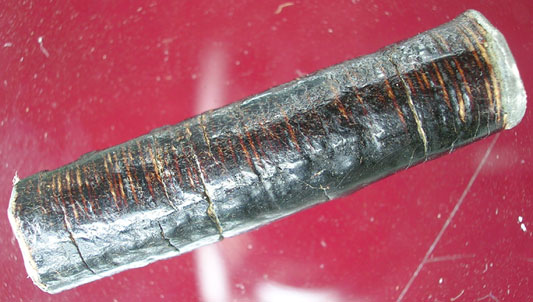 ตะกรุดดอกนี้ความยาว 1.5 นิ้วเท่านั้นใส้น่าจะทำจากเงินยวงเก่า ถักเชือกทารักแดง ตามลักษณะแบบนี้ เป็นของหลวงเอี่ยมวัดสะพานสูงครับ |