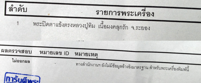 เนื่องจากผมส่งพระปิดตาแข้งตรงเนื้อผงคลุกรักไปตรวจสอบเพื่อออกบัตรให้กับผู้ชนะประมูล