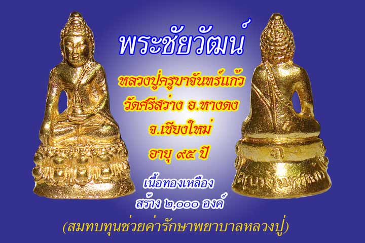 ทางคณะลูกศิษย์สายหลวงปู่ดู่ พรหมปัญโญ ได้สร้างพระชัยวัฒ์ถวายหลวงปู่จำนวน ๒๐๐๐ องค์ ได้นำออกมาให้บูชาเพื่อเป็นค่ารักษาพยาบาลหลวงปู่ในครั้งนี้ โดยให้บูชาองค์ละ ๑๐๐ บาท ท่านที่สนใจอยากร่วมทำบุญสามารถโทรติดต่อสอบถามได้ที่ คุณน้อยพร ดอกศรีเมือง ๐๘๓-๒๐๓๒๓๗๙ , คุณวรรณ ดอกศรีเมือง ๐๘๙-๖๓๑๐๗๕๘