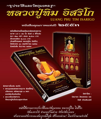 เปิดรับจองหนังสือ "ประวัติและวัตถุมงคล หลวงปู่ทิม อิสริโก" วัดละหารไร่ จ.ระยอง เป็นหนังสือปกแข็งพร้อมกล่อง ขนาด 8.5 X 12 นิ้ว จำนวน 520 หน้า พิมพ์สี่สีทั้งเล่ม ในเล่มพบกับ พระขุนแผนผงพรายกุมาร พิมพ์ใหญ่ ฝังตะกรุด 3 ดอก องค์เดียวในประเทศไทย และวัตถุมงคลที่หลวงปู่ทิมปลุกเสกนอกวัด จัดทำโดยคุณนิลนารถ วัฒนธรรม และคุณกิตติ เกียรติมนตรี ผู้จัดทำหนังสือหลวงปู่ทิมเล่มสีแดง และเล่มสีน้ำเงิน จัดพิมพ์แะออกแบบโดย บริษัท คอมม่าดีไซน์แอนด์พริ้นท์ จำกัด ผู้จัดทำหนังสือดีเด่น 2 ปีซ้อน