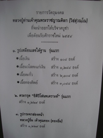 หนังสือนะโม ฉบับล่าสุด ลงข้อมูลว่าท่านออกวัตถุมงคลรุ่นใหม่ออกมาเป็นรูปหล่อ รุ่นเลขใต้ฐาน หลังจากที่ทางวัดเคยออกเหรียญรุ่นแรกมาแล้ว เมื่อประมาณช่วงปลายปี53 ดูจากข้อมูลแล้วรูปหล่อเนื้อเงิน สร้างน้อยมากเพียง108องค์เท่านั้น คาดว่าคงจะเป็นอีกรายการที่จะหายากในอนาคต