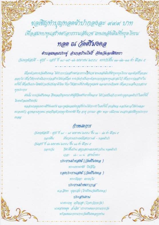 | หัวข้อกระทู้ : ขอเชิญร่วมประมูลทำบุญ ในช่วงสงกรานต์ปีนี้ด้วยกันนะครับ... |