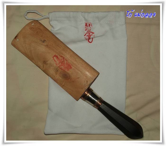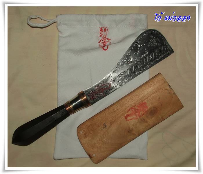 หลวงพ่อ จารมือ ที่ใบ อีกทั้งสองด้านของมีด และปั้ม กันชงสีแดง เอาไว้ 4 ที่ ไม่ธรรมดาครับเล่มนี้