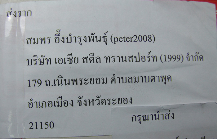 เป็นพัสดุจากคุณสมพร user peter 2008 ครับ เข้าใจว่าน่าจะส่งผิด