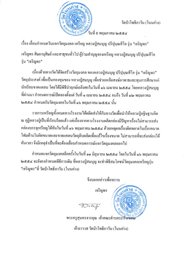 มีเหตุจำเป็นต้องกำหนดเลื่อนรับวัตถุมงคลดังกล่าวเป็น วันเสาร์ที่ 11 มิถุนายน 2554