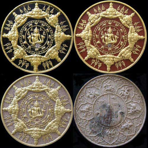 2. เหรียญปิดตาพังพกาฬ เนื้อทองคำลงยา 1 เหรียญ, เนื้อเงินลงยา 1 เหรียญ, เนื้อเงิน 1 เหรียญ, เนื้อนวโลหะ 1 เหรียญ, เนื้อทองแดง 10 เหรียญ รวม 1 ชุด 14 เหรียญ ขนาด 3.2 ซม. สร้าง 39 ชุด จองชุดละ 39,000 บาท