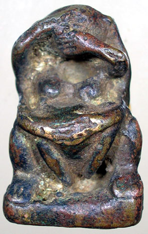 พระปิดตาเนื้อโลหะผสมหรือจะเรียกรวมว่า เนื้อสัมฤทธิ์ เทแบบทุบเบ้าโดยวิธีโบราณคือการปั้นหุ้นเทียนทีละองค์ และมีโลหะอะไร ก็หลอมรวมกัน จะเห็นเนื้อทองคำถูกเทปนบริเวณลำแขนองค์พระ ซึ่งพิมพ์พระไม่มีโอกาสเหมือนกัน ถ้าเหมือนกันได้ตีเก้ไปเลยครับ การดูโลหะหล่อโบราณ หรือดูของเก่า ต้องเน้นดูตามซอกครับ ตามซอกเป็นจุดที่ทำให้เก่าไม่ได้ เพราะเป็นผิวด้านใน พระองค์นี้ตามซอก ฟ้องความเก่ามากครับ อายุน่าจะประมาณ 60 ปี ขึ้นไปนั่นก็คือ ราวปี 2485 ขึ้นไปครับ