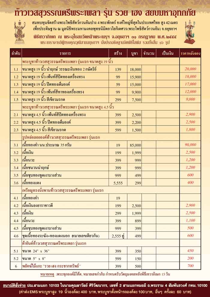 รายละเอียดต่างๆ รอให้คุณบิ๊กมาเปิดเผยเองดีกว่าครับ รับรองว่าท่านที่จองท้าวเวสสุวรรณตรีพระเพลา รุ่น รวย เฮง สยบมหาอุทกภัย ได้ยิ้มกันทั่วหน้าและคาดว่าจะรีบจองเพิ่มกัน ส่วนท่านที่ยังไม่ได้ตัดสินใจจองก็คงต้องรีบหน่อยแล้วครับเพราะราคาจองมีเวลาอีกแค่ 1 สัปดาห์เท่านั้นครับ