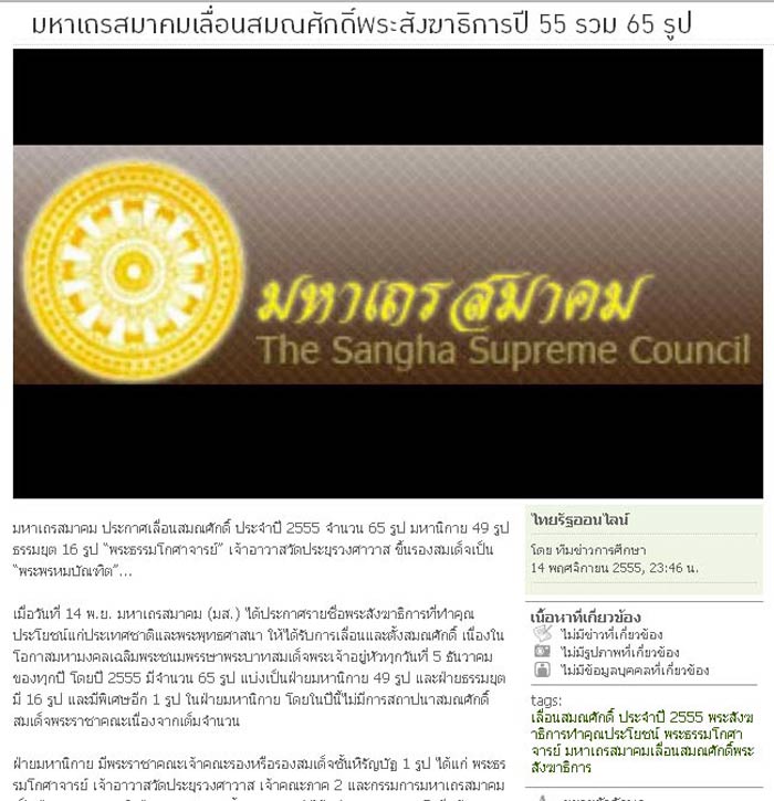 เมื่อวันที่ 14 พฤศจิกายน พ.ศ.2555 ผู้สื่อข่าวรายงานว่า การประชุมมหาเถรสมาคม (มส.) ซึ่งมีสมเด็จพระพุฒาจารย์ ประธานคณะผู้ปฏิบัติหน้าที่สมเด็จพระสังฆราช เป็นประธาน