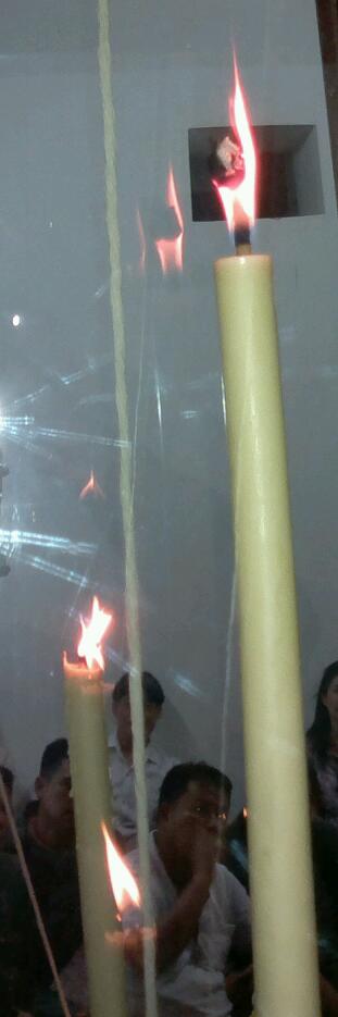 ในขณะที่หลวงปู่หวลนั่งอธิฐานจิตปลุกเสกก่อนดับเทียนชัยมีผู้เข้าร่วมพิธีกรูกันเข้าไปถ่ายภาพที่ตู้เทียนชัยขณะนั้นผมนั่งอยู่ไกลเกิดความสงสัยว่าเขาเข้าไปถ่ายอะไรมีคนที่นั่งใกล้ผมบอกว่าหลวงปู่ได้ถอดจิตออกไปแล้ว และให้ผมไปถ่ายภาพเก็บไว้ผมจึงเข้าไปถ่ายด้านข้างพอกลับมาดูรูปประหลาดใจพบรูปเปลวไฟมีลักษณะเป็นเศียรพระพุทธรูป จะดูเป็นหันหน้าออกหรือหันหน้าเข้าก็ยังดูเป็นเศียรพระพุทธรูป |